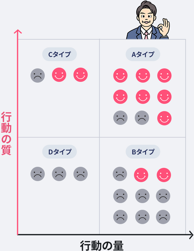 「行動の量×質でメンバーの状況を、行動の質と量に基づき4タイプに分けて指導する」というアプローチで、抜擢された新しいリーダー層への集合研修を実施しました。これにより、指導の基準が統一され、品質が底上げされた結果、業績達成率がアップしました。