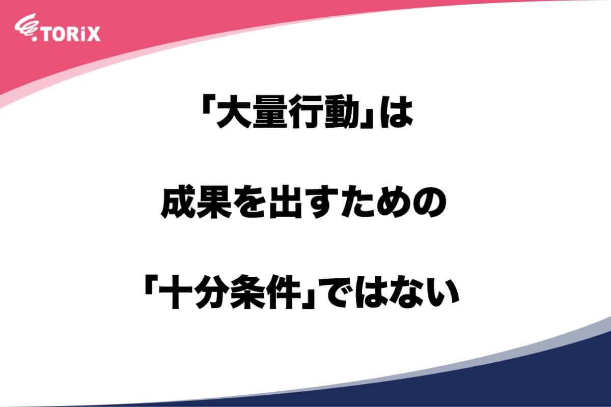 しかし、実際には大量行動をしているにも関わらず成果が出ないケースもあります。つまり、大量行動は成果を出すための必要条件ではあるが、十分条件ではないということです。大量行動をすれば必ず成果が上がるかというと、そうとは限らないのです。