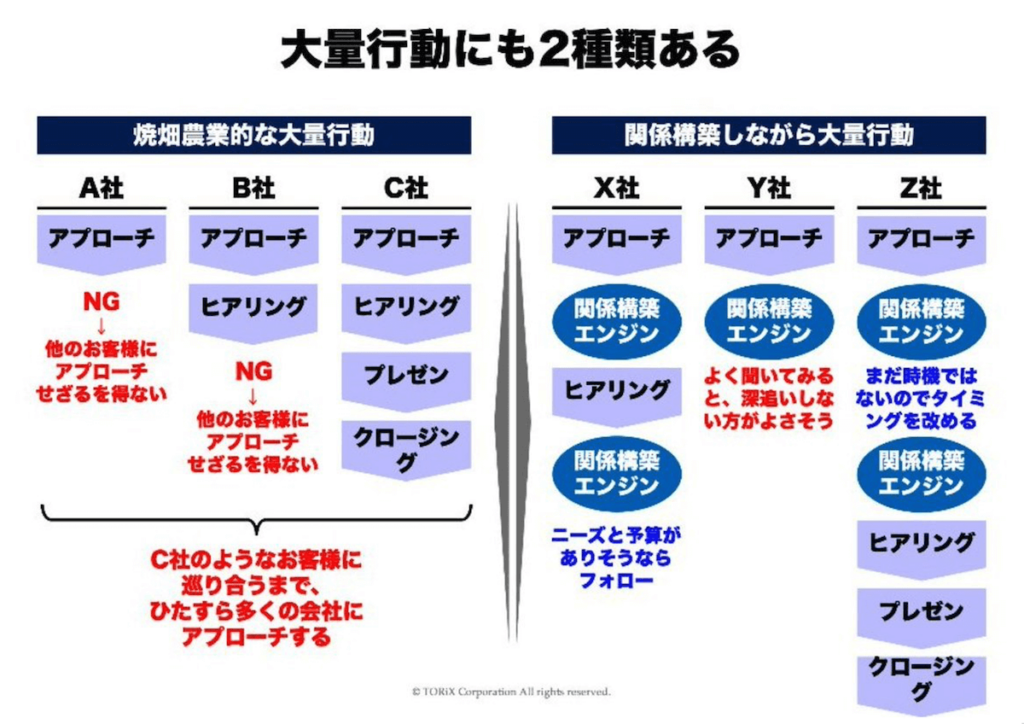 「駄目だったら次」を繰り返していると、「リストが分厚くなっていく」という感覚が生まれません。だからこそ、お客様との間で「関係構築エンジン」を回しながら大量行動をすることが重要なのです。