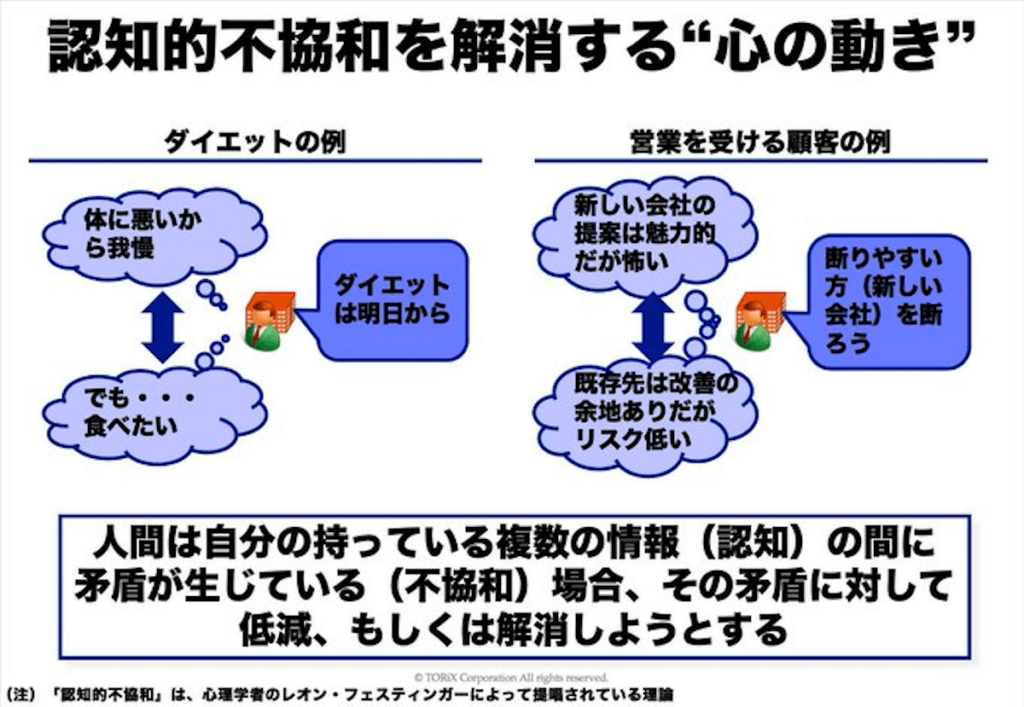 「自信を持って買ってくださいと言おう」といった指導を受けても、それを実行できずクロージングに悩む営業は少なくありません。そこでおすすめなのが、お客様の「認知的不協和」を解消することです。認知的不協和を解消することができれば、受注率は上がります。