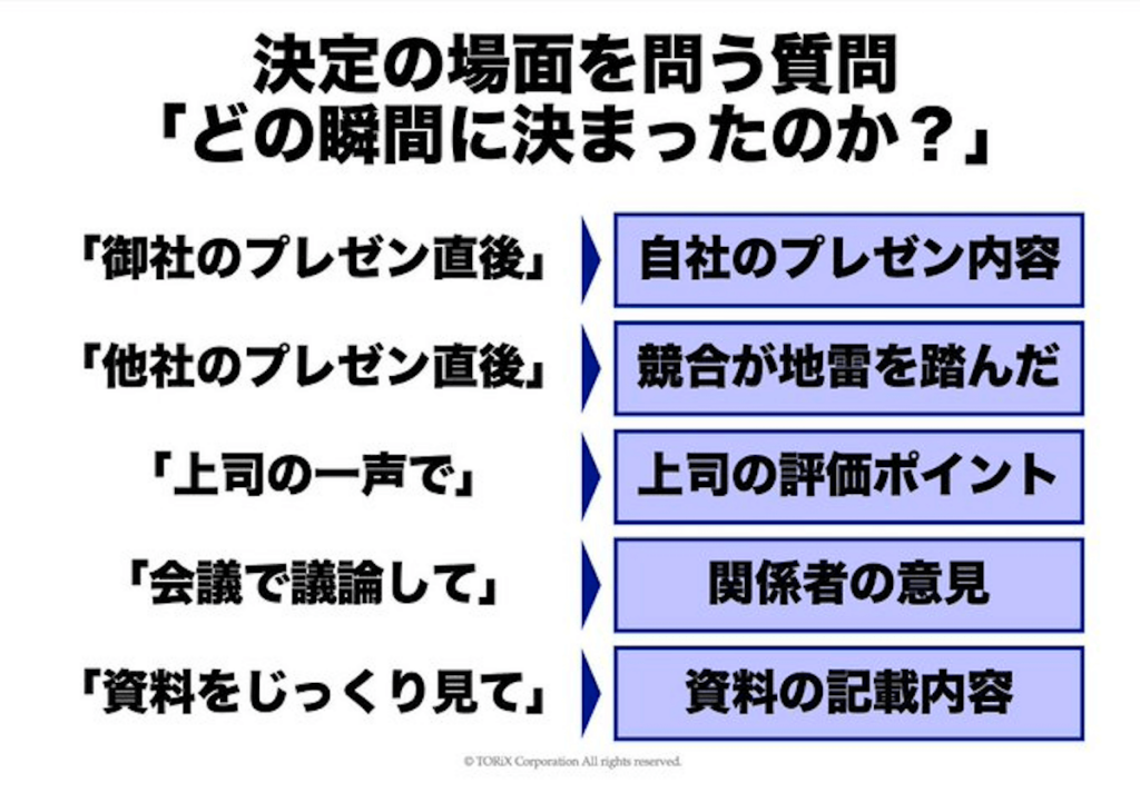 クロージングの精度を上げるには「お客様は迷ったとき、どのような要因で心が動くのか」を深く理解することが重要です。そしてそれには、「接戦案件の決定場面で、お客様の心がいつ動いたのか?」に関する情報を集めることが有効です。そのため、チームで「決定場面のヒアリング」に関するデータを蓄積するようにしましょう。
