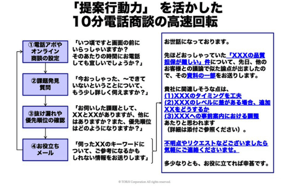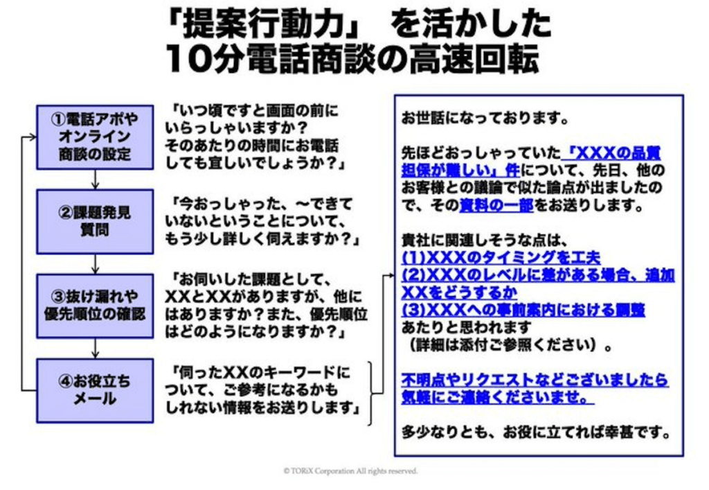 「10分電話商談」は練習によって習得可能なスキルです。わずか数分の会話でも、「課題の深掘り」や「要件の整理」を行うことができます。このようなスキルはロールプレイでの練習が効果的です。さらに、チーム内で情報を共有しておけば、「10分電話商談直後のメール」も迅速に送ることができ、結果として商談の回転数と行動量の向上につながります。