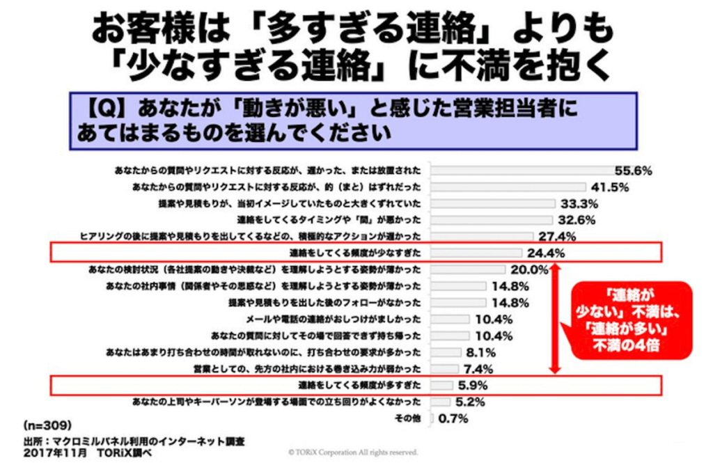 営業の多くは、「行動量を増やすべきだろうか。それとも過度な連絡でお客様に嫌がられるのではないか」という葛藤を抱えています。しかし、調査データによれば、お客様の「連絡が少ないことへの不満」(24.4%)は、「連絡が多いことへの不満」(5.9%)の4倍にのぼることが分かっています。
