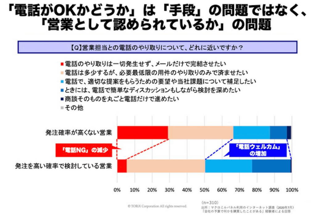 お客様になかなか電話が繋がらない状況について、多くの営業は「お客様は電話を嫌がっている」と考えがちです。しかし実際は、「信頼関係のない営業からの電話を嫌がる」というのが本質です。つまり、これは手段としての電話の問題ではなく、営業として認められているかどうかの問題といえます。