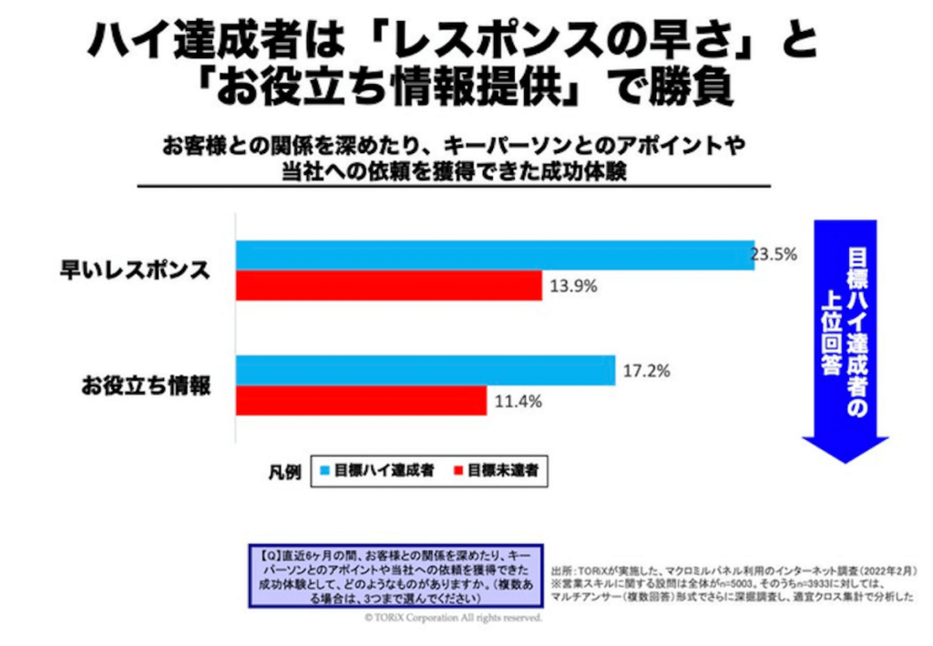 5,003人の営業を対象とした調査によると、目標を達成する営業は「迅速なレスポンス」と「有益な情報提供」を強みとしています。目標未達の営業が関係の希薄なお客様に「ご検討状況はいかがでしょうか」と連絡してスルーされている一方で、目標達成者は「先日伺った件についてこのような情報があります」と、素早いフォローを電話やメールで行っています。