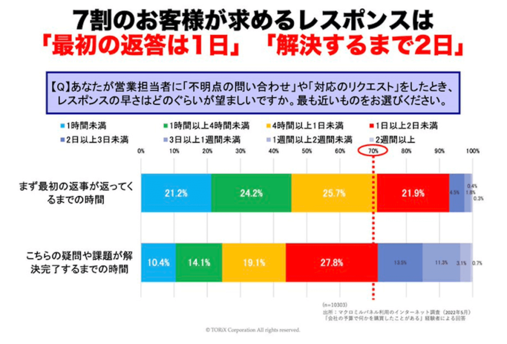 弊社が実施した「お客様1万人調査」では、7割のお客様が「最初の返答は1日以内」「解決までは2日以内」のレスポンスを求めています。「1日以内の返信」を心がける営業は多いものの、「2日以内の解決」については課題が残ります。商談で受けた宿題を「次回の打ち合わせで」と先送りにすると数日が経過してしまうため、「電話とメール」での迅速な解決が望ましいとされています。