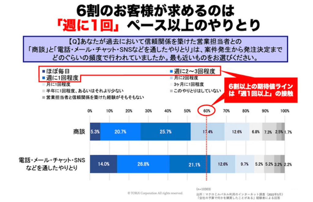 また、「お客様1万人調査」では「過去に信頼関係を築けた営業とのやり取りの頻度」について6割のお客様が「週1回以上」のやり取りを求めているという結果が出ました。このことから、営業にとって「電話の仕方、メールの書き方」は必須のスキルと言えます。