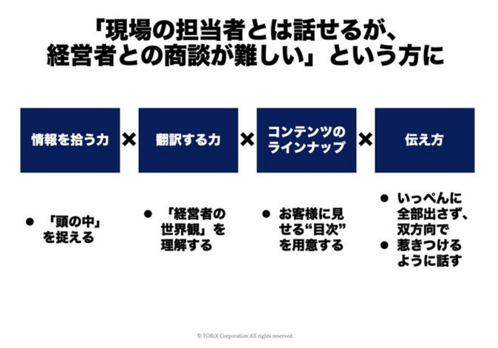経営者との商談では、相手に「発見」や「気づき」を提供できなければ、時間を確保することは困難です。経営者の抱える課題や悩みに対して有益な情報を蓄積し、「情報を拾う力」「翻訳する力」を活かしていきましょう。