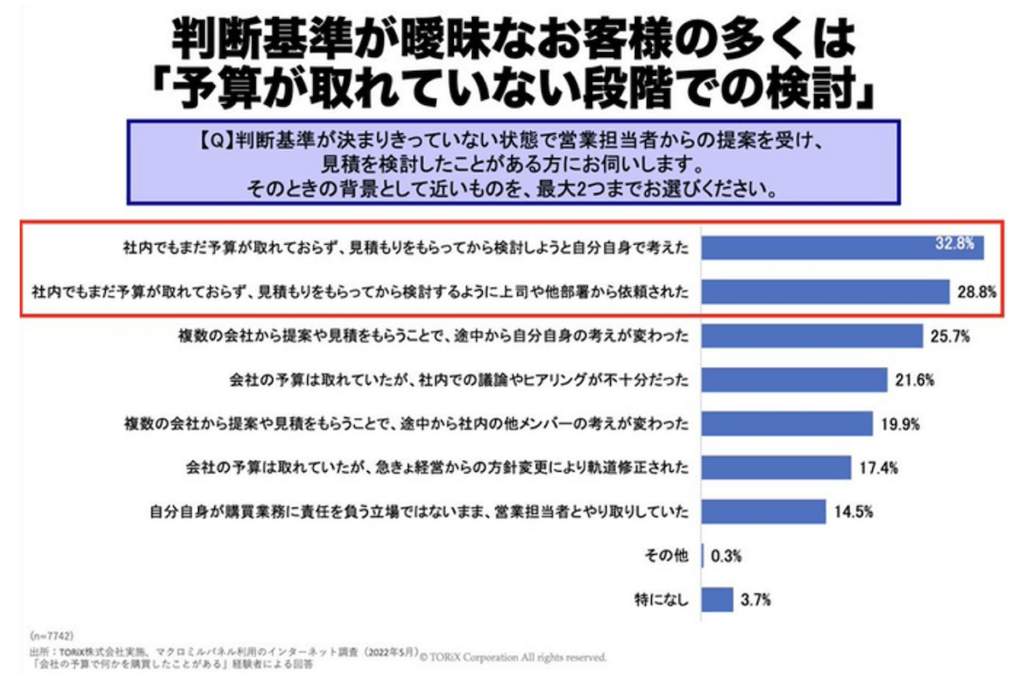 営業が直面する典型的なケースとして、「予算はどのくらいでお考えですか?」と質問しても「まだ決まっていないんです」という返答がなされるケースが挙げられます。弊社が実施した「お客様1万人調査」の結果からも、判断基準が曖昧なお客様の多くは「予算が取れていない段階での検討をしている」ということが明らかになっています。このような状況では「予算が社内でどう決まるか」への理解が重要となります。