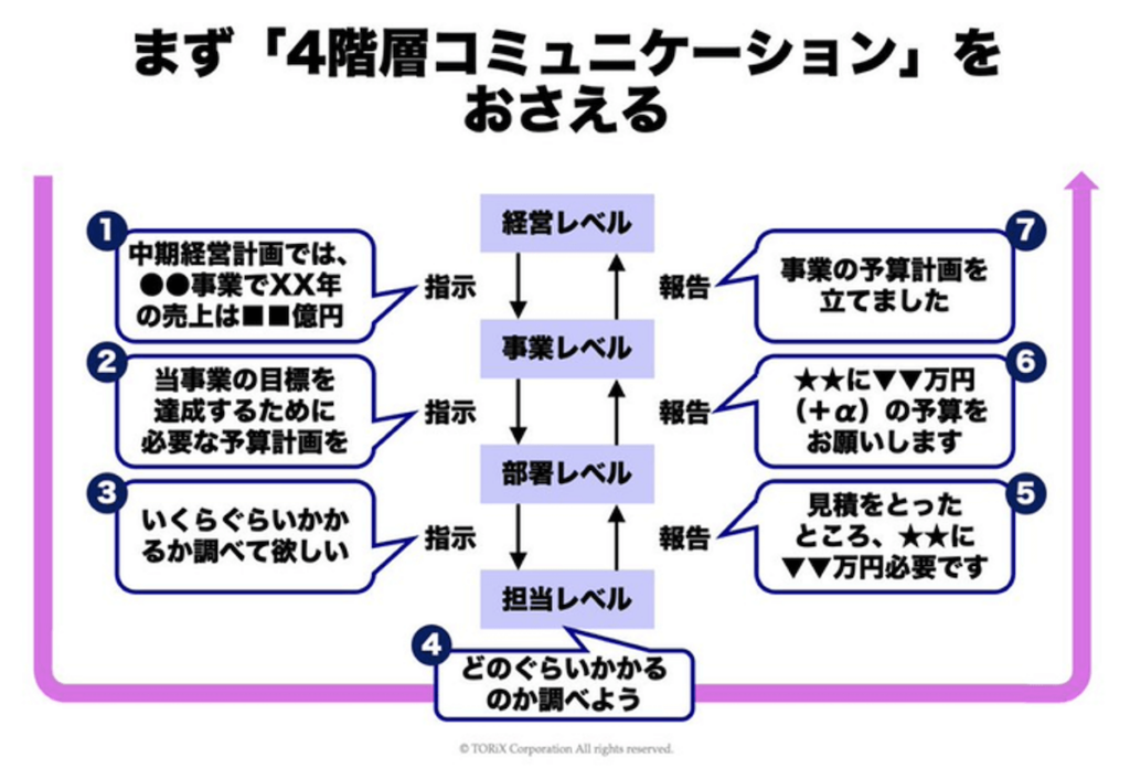 予算の動きを理解するための前提として、「4階層コミュニケーション」の把握が必要です。これは「経営⇔事業部⇔部署⇔担当」という階層間でどのようなやり取りが行われているかを理解することです。特に若手の営業はこの概念を理解することが難しい場合があるため、自社内の予算策定プロセスについて上司に確認することをおすすめします。