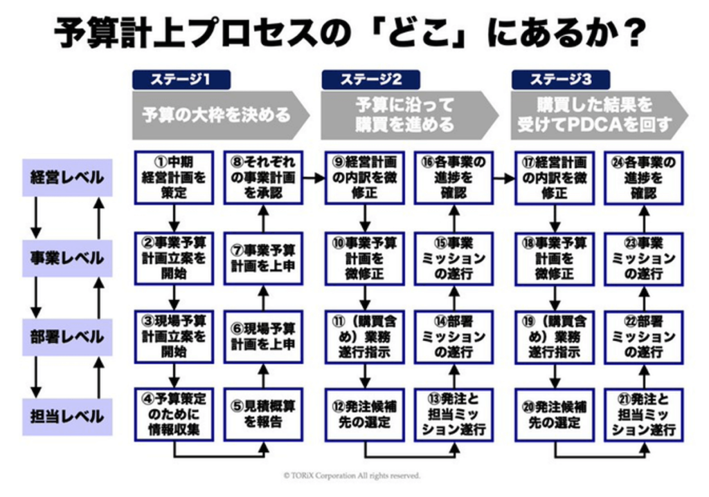 4階層コミュニケーションを理解した後は、「お客様の現在地は、予算計上プロセスのどこにあるか?」という視点を持つことが重要です。「予算の大枠を決める→予算に沿って購買を進める→購買した結果を受けてPDCAを回す」というステージの進捗に合わせて、階層間のコミュニケーションが行われています。