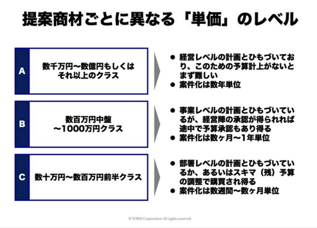 商材の単価によっても状況は異なります。会社の規模や商材の特性による違いはありますが、大まかに以下の3つのレベルに分類できます。