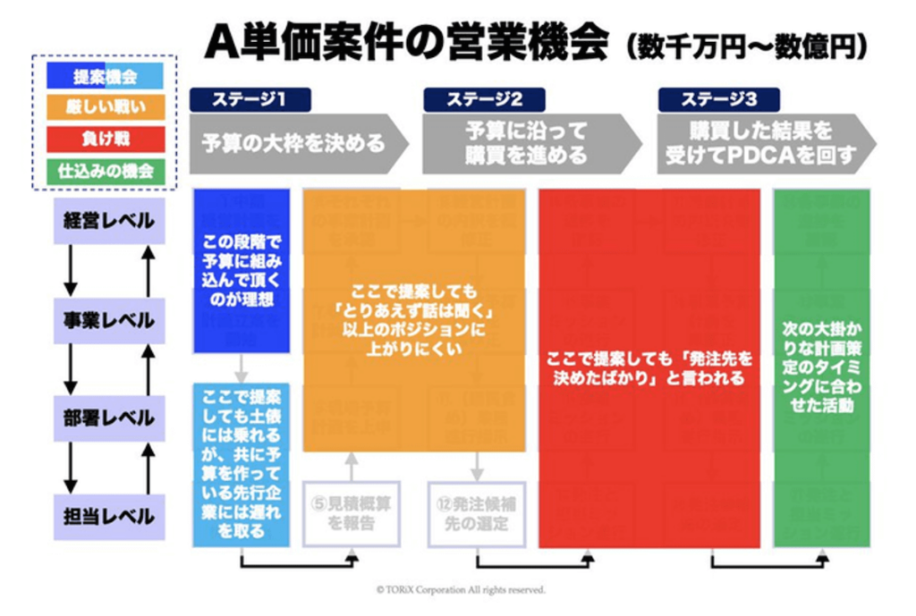 高額商材の場合、数年単位での会社の計画に組み込まれる必要があるため、「経営計画の中に予算として入れていただくまでの段階」が主戦場となります。計画に乗り遅れた場合は、次の「波」に向けて準備を進める必要があります。