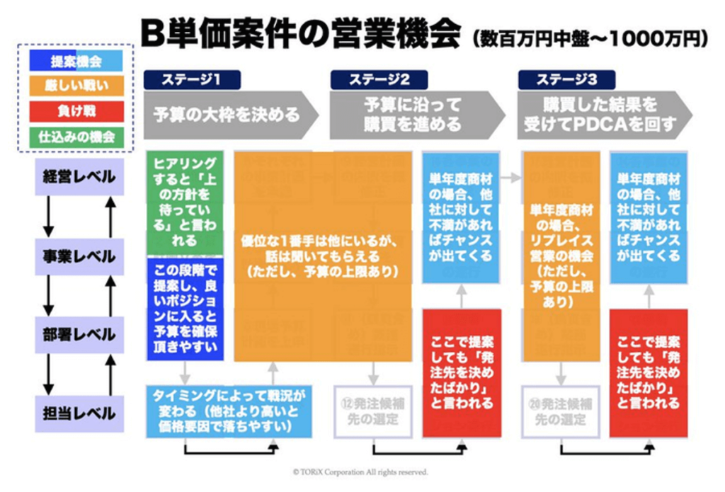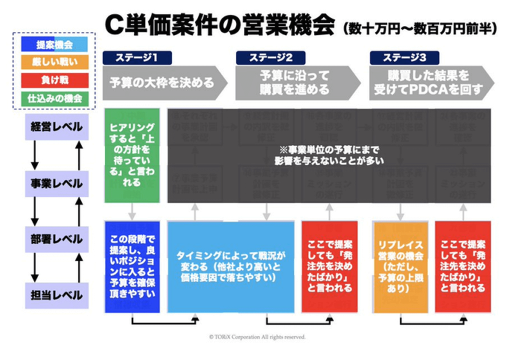 小規模金額の商材は、「経営計画」というよりも「部署のミッション遂行」の観点から捉えることで、毎年コンスタントに提案機会を得ることができます。経営計画が定まった直後が有利ではありますが、状況が変化しやすいため、お客様との継続的な接点を維持することが重要です。