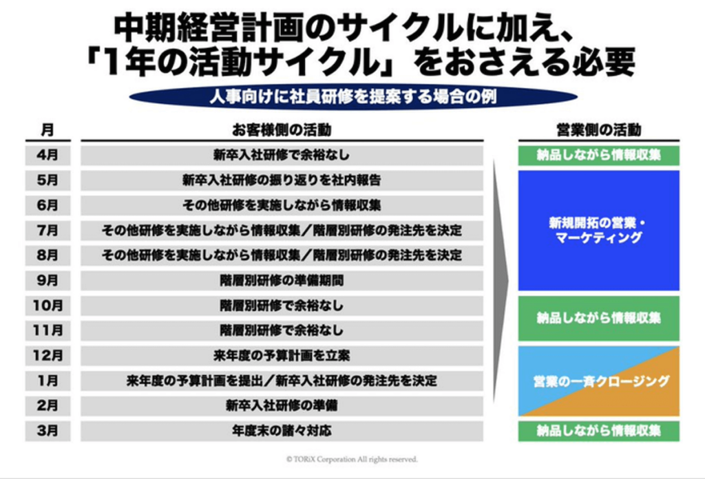 お客様の背景を理解するためには、中期経営計画のサイクルに加え「1年間の活動サイクル」を把握し、それに合わせて自社営業組織の年間活動計画を立てる必要があります。「お客様側の1年間の動きが見えているか?」という点を見落とすと、日々の活動の成果が上がりにくくなります。これは指揮官の手腕が問われる部分です。
