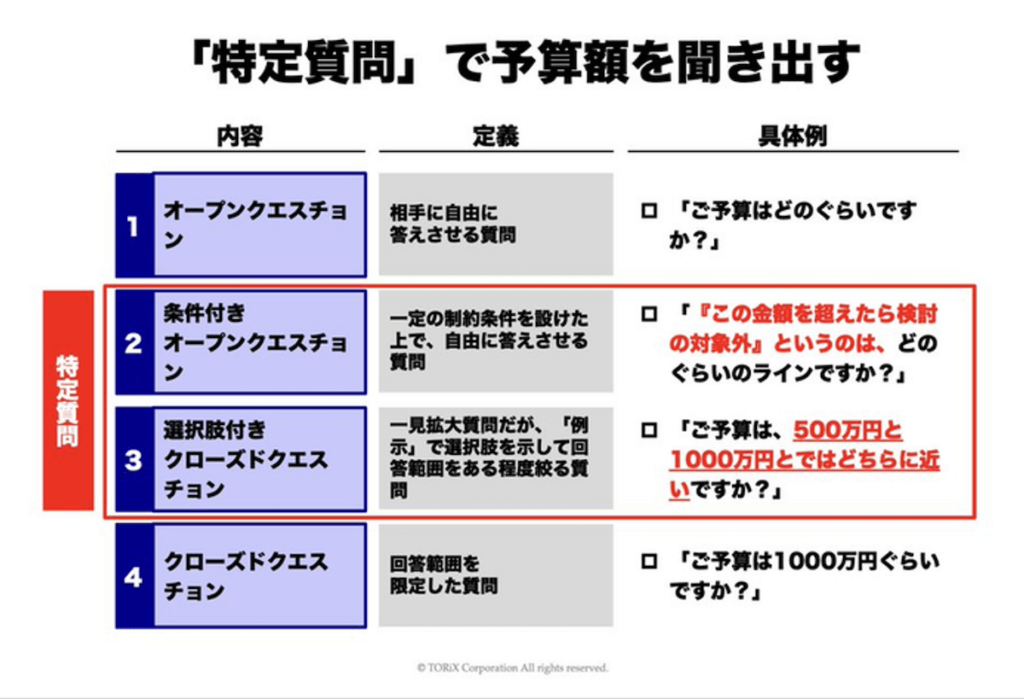 予算「額」を聞き出すための方法として、お客様がまだ正式に予算を立てていない場合でも、営業としては「概算としてどのくらいの金額が見込めるか」を把握しておく必要があります。そのためには「特定質問」を活用します。単に「ご予算はいくらですか?」と聞くだけでは、金額を把握することは困難です。