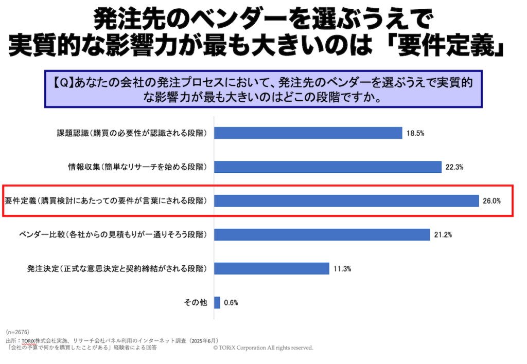 当社が実施した「2,676人調査」では、「各社からの見積もりが一通り揃う段階における影響力(ベンダー比較段階)」がベンダー選定において実質的に最も影響力が大きいという回答は21.2%でした。一方、「簡単なリサーチを始める段階が発注先のベンダーを選ぶ上で実質的に影響力が大きい(情報収集段階)」という回答は22.3%でした。