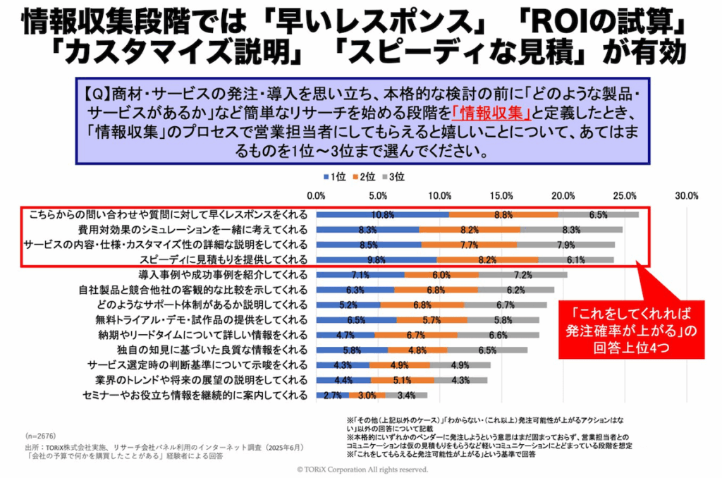 初回訪問でお客様が「今はまだ情報収集段階です」とおっしゃっても、通り一遍の商品説明だけをするのは適切ではありません。当社が2,676人の購買者に対して実施した調査では、情報収集段階において「これをしてくれたら発注確率が上がる」とお客様が回答された上位4つの項目は「早いレスポンス」「ROIの試算」「カスタマイズ説明」「スピーディな見積」でした。