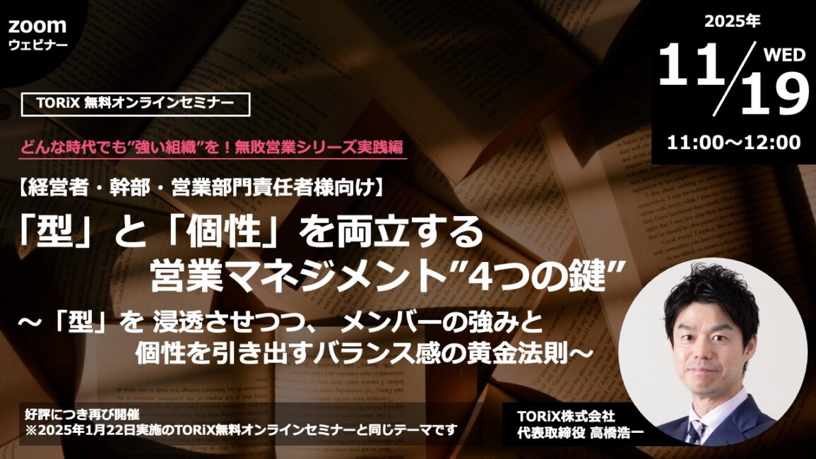 そこで本セミナーでは、「型」と「個性」を両立させる営業マネジメントの実践方法を解説します。