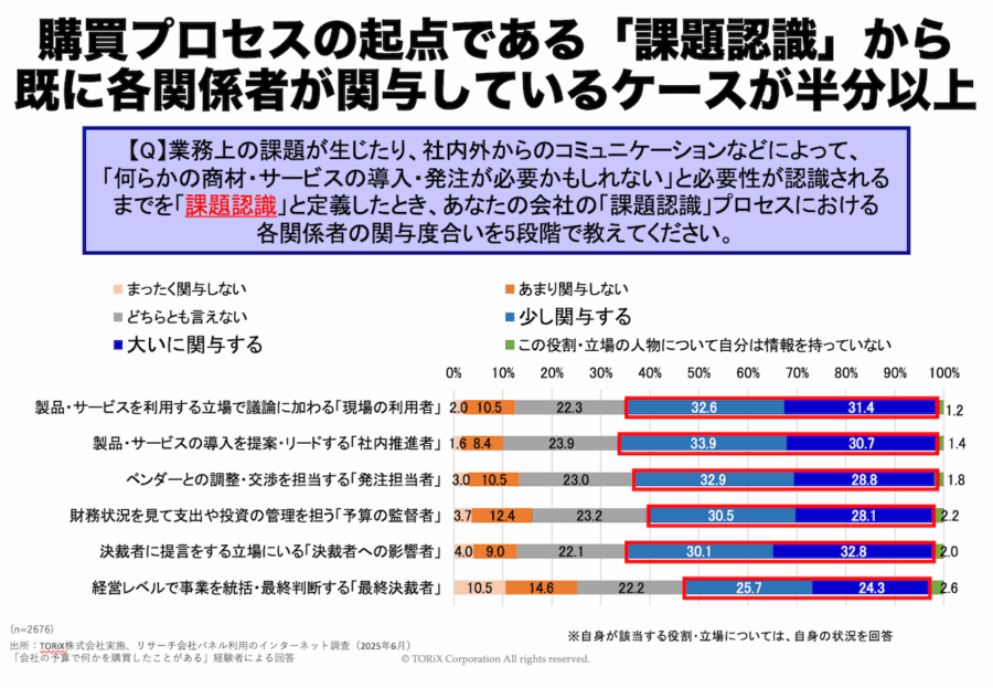 購買プロセスには多様な関係者が存在します。現場の利用者、社内推進者、発注担当者、予算の監督者、決裁者への影響者、そして最終決裁者。それぞれが異なる役割を持ち、異なる視点で購買に関与しています。