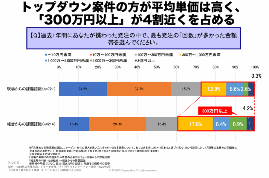こういったアプローチの効果は、その案件が現場からの課題認識による「ボトムアップ案件」なのか、経営層の方針転換による「トップダウン案件」なのかによって大きく変わることが、当社が実施した2,676名の購買経験者を対象とした調査で明らかになりました 。