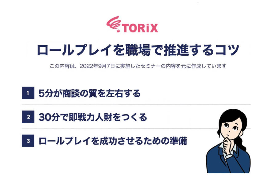 今回は、ロールプレイを職場で推進するコツについて資料にまとめました。