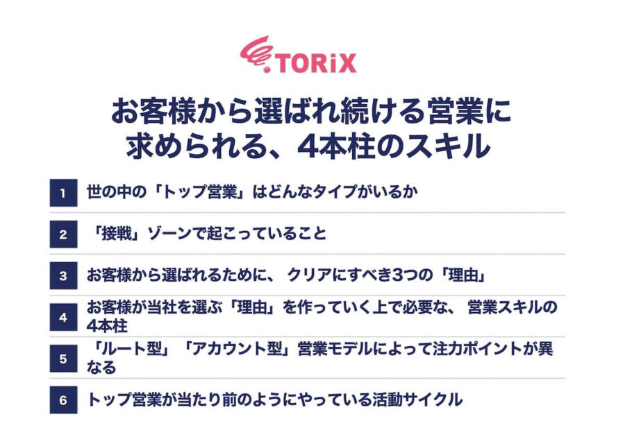 「接戦ゾーンにおける勝ち方」を再現性高く実行できるようになるための4本柱、「質問力・価値訴求力・提案ロジック構築力・提案行動力」について、本資料にてスライドで解説しております。